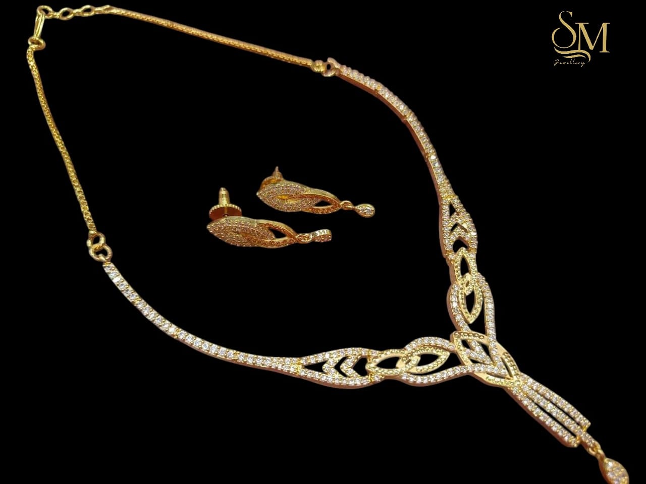 Graceful and refined, this American Diamond Leaf Vine Necklace Set is designed for those who adore contemporary elegance. It features a fluid leaf-inspired vine motif, intricately studded with brilliant AD stones. The necklace is paired with sleek drop earrings that mirror the same refined design. Crafted in a 1 gram gold finish, this piece is ideal for formal events, evening functions, or gifting.