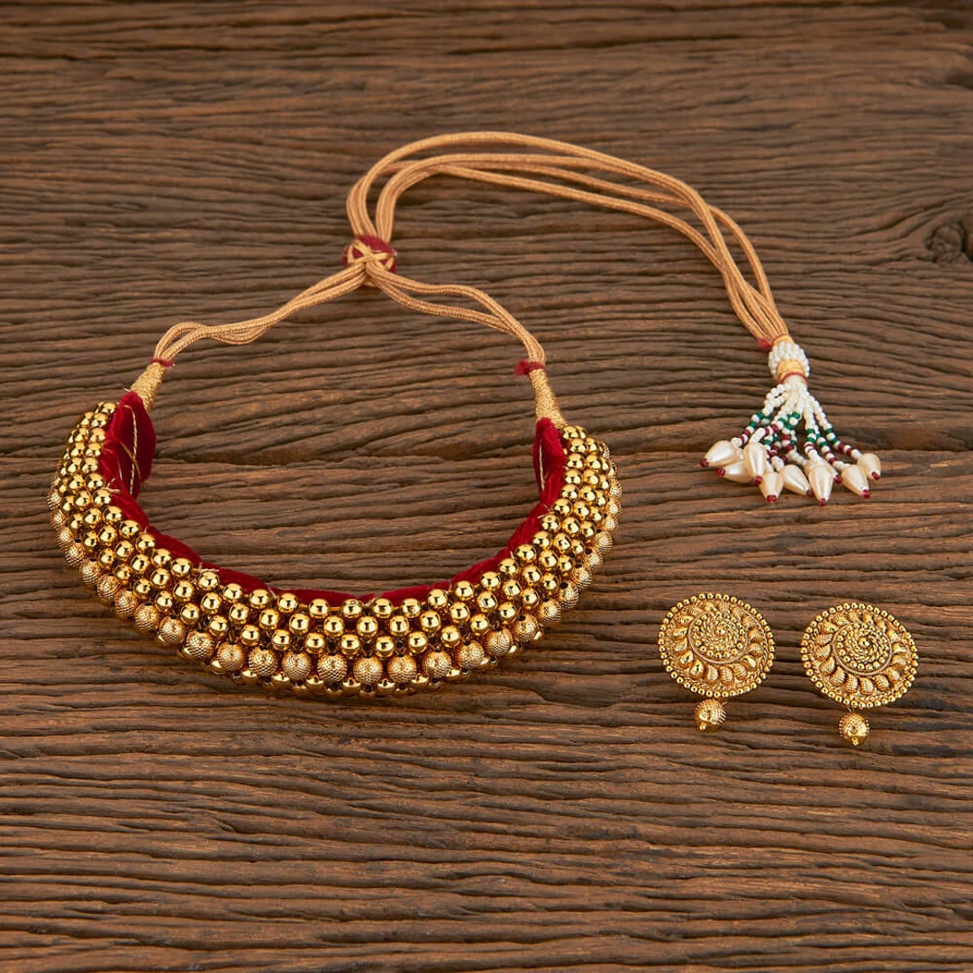 Elevate your ethnic look with this Kolhapuri Thushi Necklace Set, crafted with traditional Maharashtrian aesthetics. This set includes a classic Thushi necklace featuring intricate gold-finish beads, a secure red dori (thread), and matching earrings to complete your festive or bridal ensemble.